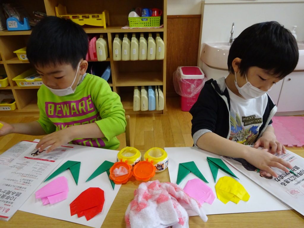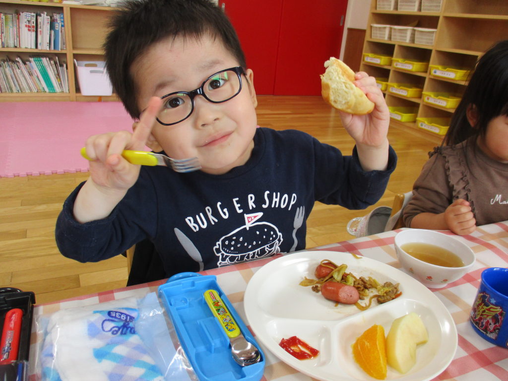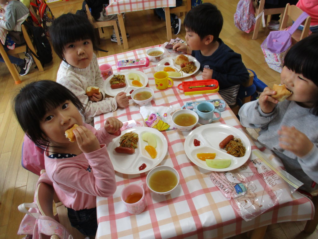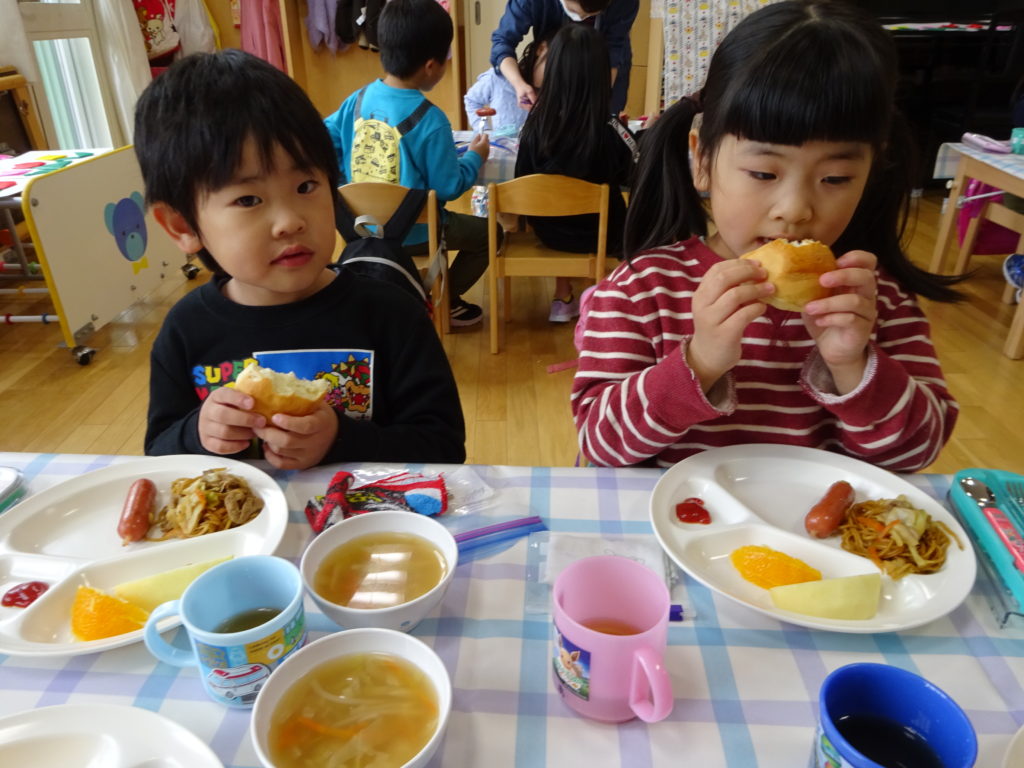 初めてのランチ(#^.^#) 日付:2021/05/11 今日は年長組、年中組はお部屋で製作をしました! のりをつけて紙にバランスよく貼るの難しかったね。 そして今年度初めてのランチでした! 始めのうちは子ども達が食べやすいメニューを考えています。 焼きそばにパン、野菜スープ、、、栄養たっぷりです! 野菜が苦手な子も少しずつ食べるの頑張ったね(*^^*) これからもおいしいごはんたくさん食べて大きくなろうね!!