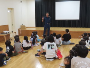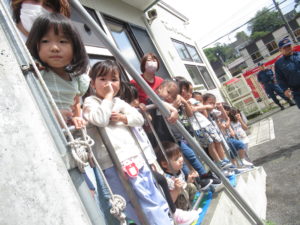 今月は、防災月間です。今日は消防士さんたちが来てくださって避難訓練を行いました。梅ヶ枝町の町内会長さんも一緒に参加してくださいました。同じ町内の幼稚園をいつも気にかけていただいています。