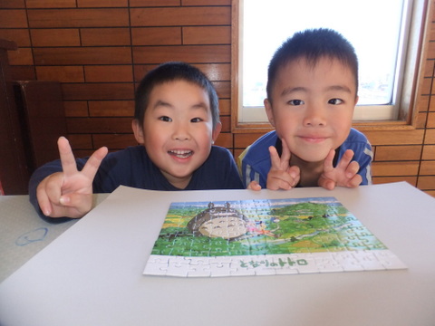 年長組の男の子と年中組の女の子。『ここかな?』『あっピッタリ!』