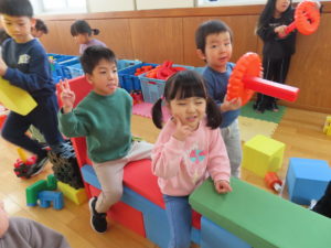 ブロックで列車を作ったり、筒けんチャレンジをしたり…