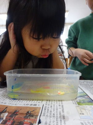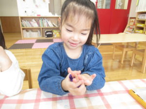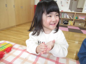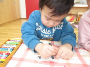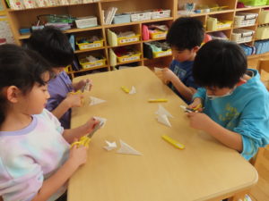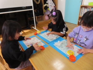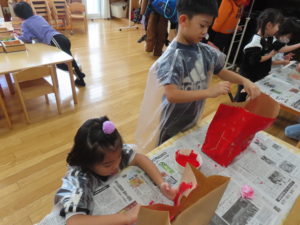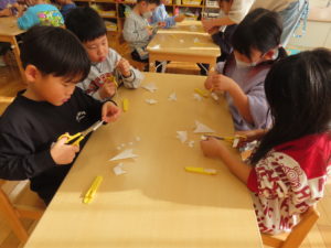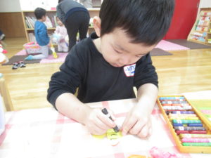 製作をしました。先生のお話を聞いて、書いたり・切ったり・折ったり・塗ったり…