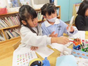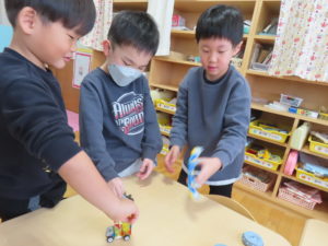 年長さんはカプラを真剣に作っていたり、たまごっちの絵を描いて手作りシール帳に貼ったり…♡ ホールではマリオカートごっこやホッケー、ドーナツ屋さんなど、たくさんの遊びが繰り広げられていました♪