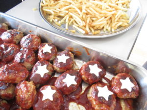 メニューは、カレーライス、おにぎり、から揚げ、サラダ、ウインナー、ハム、ブロッコリー、ハンバーグ、焼きそば、ポテト。