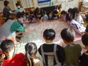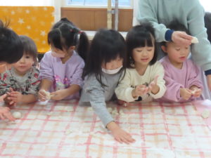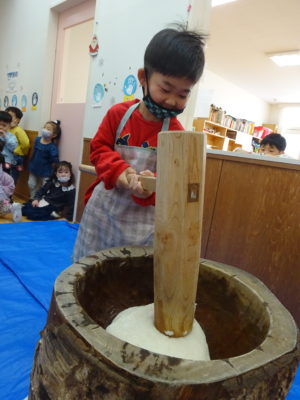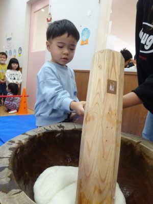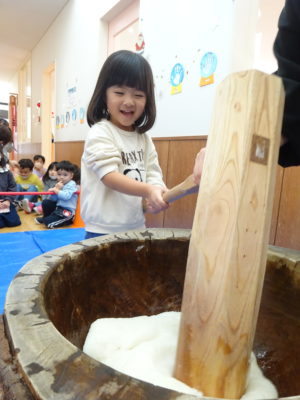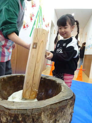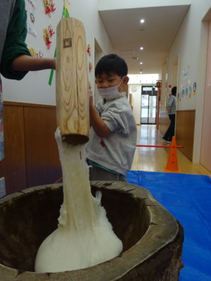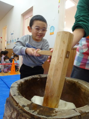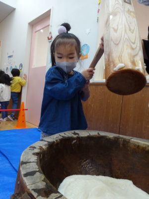 その後は1人ずつおもちをぺったん、ぺったん…少し重たいけれど、力いっぱい頑張りました☆