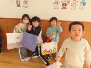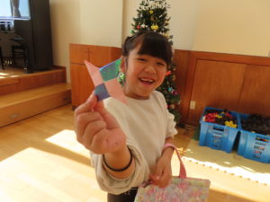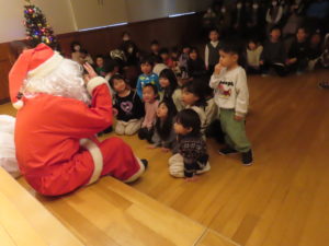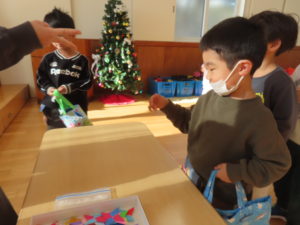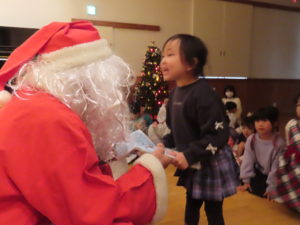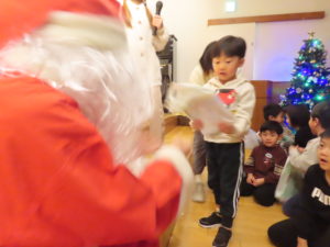 子どもたちは大喜びで、サンタ村から来たサンタさんに「ありがとう!」とお礼を言いながらプレゼントをもらいました☆