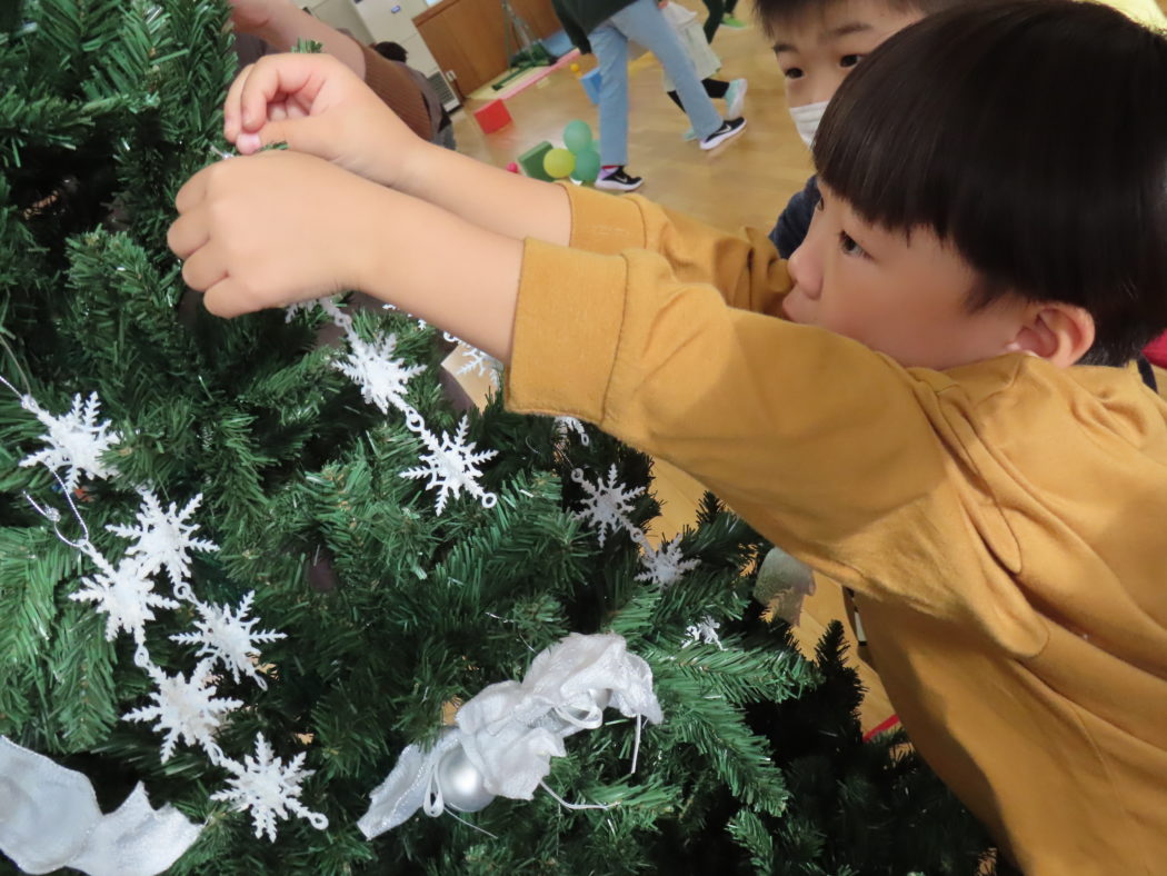 今日は幼稚園のみんなでクリスマスツリーの飾り付けました。