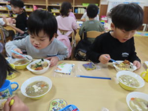 にんじん、じゃがいも、こんにゃく、ごぼう、そして幼稚園で収穫したさつまいもなどが入った具沢山の豚汁です(*^^*)