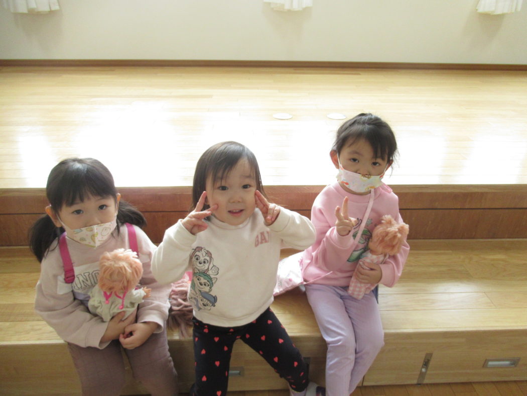 今日も元気に幼稚園の中で遊び、ホールでは赤ちゃんのお人形を抱っこし、お散歩ごっこやブロックでお家や車を作ったり、だるまさんが転んだ・・・等とお友達と楽しんで遊んでいましたよ(*^-^*)