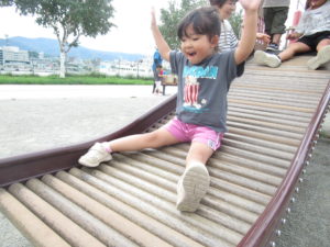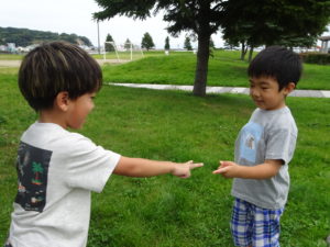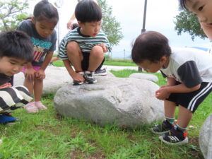 今日は子どもたちが楽しみにしていた遠足でした!お約束①前のお友だちとおへそをくっつけて歩くこと②建物側の道路を歩くこと③先生のお話をよく聞くこと この3つのお約束をしてから年長・年中・年少の順に並んでいざ、出発!40分ほど歩いて公園に到着し、遊具や大きな石が並んでいる所でニコニコで遊んでいました(*^^*) 大きな石が並んでいる近くにキノコを発見した子どもたち!「触らずに見るだけだよ」と先生の話を聞き、興味津々で見ていました☆