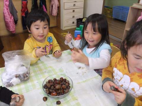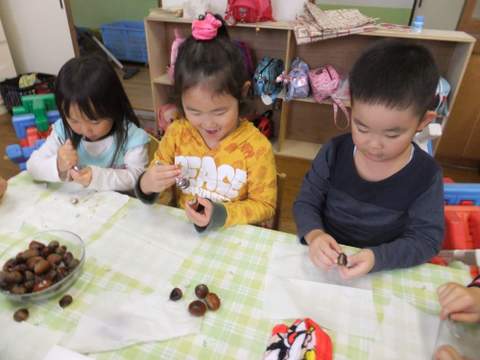 今日の栗仲間は、やはりお家の人と栗拾いをした経験のあるお子さんが多かったです。その仲間につられて入っていたお友達もいましたが、経験って本当に大切ですね。