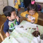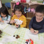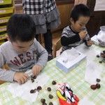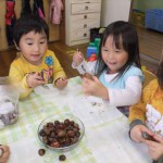 昨日は、苦手意識の強かったお友達が「俺、栗仲間に入る」と言って座りました。昨日は、「一回食べたでしょう」と頑なに食べたがらなかったのに・・・