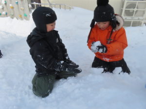 雪遊びで着替えをしたお友だちもいますので、次の登園日に新しい着替えを持たせるようお願いします!また、雪遊び用の着替えをまだ持って来ていない子は持たせるようお願いします!
