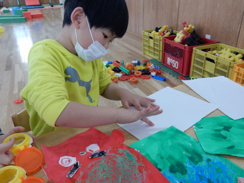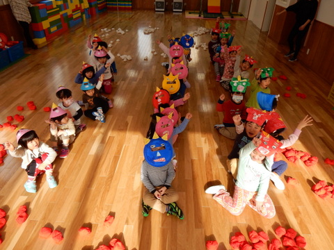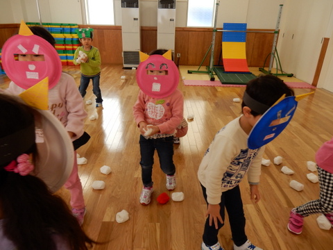 豆まきといっても、手宮幼稚園では運動会で使う紅白玉をまきます(^^)/