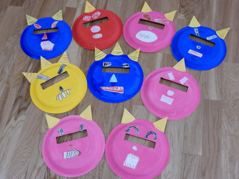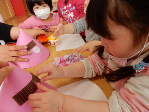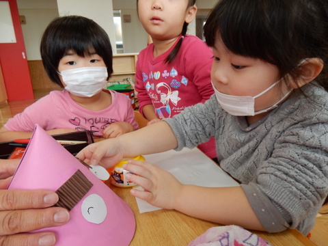 みんなで作った色々な表情の鬼のお面をつけて、今日は豆まきをしました!!