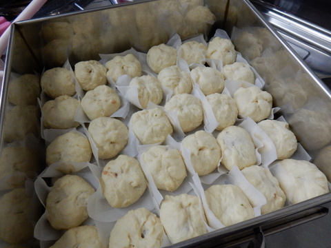ラーメンのお供には、肉まん!皮から手づくり。よく練った肉まんのあんを上手にひねりながら包みます。