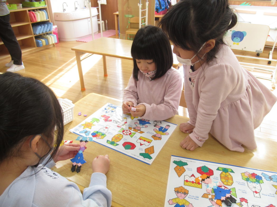 午前中の自由遊びの時間、年長さんのお友だちは、机の上でゲーム遊びを楽しんでいました。形を組み合わせて、イラストを完成させる遊びです。お友だちと一緒に出来上がりを楽しみにしながら作っていました(*^^*)
