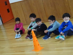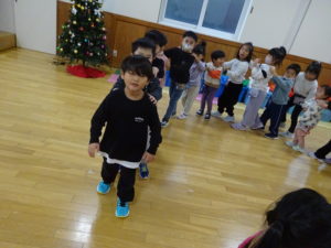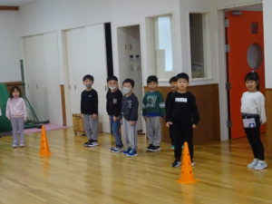 準備体操にリトミック(音に合わせてスキップで動き、回数に合わせて特定の動きをする運動遊びです)をして、その後にじゃんけん列車をしました!